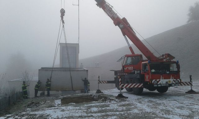 Die 14,5 Tonnen schwere Betongarage auf dem Feuerwehrgrundstück wurde mit dem Kran der Stadtfeuerwehr Feldbach auf die vorgerichteten Fundamente gehoben.
