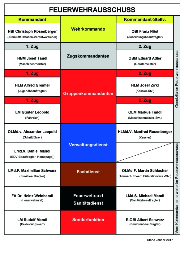 Der Feuerwehrauschuss wurde nach der Neuwahl des Feuerwehrkommandos in der ersten Ausschusssitzung 2017 neu konstituiert.